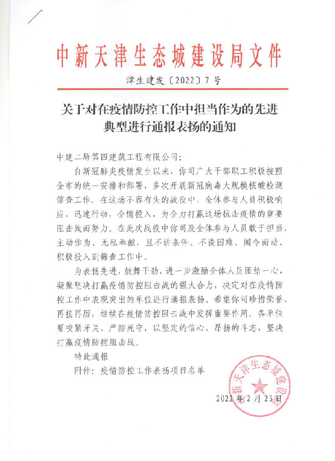 近日,公司收到來自中新天津生態(tài)城建設(shè)局的文件。文件對(duì)公司天津貽成學(xué)府項(xiàng)目在疫情防控工作中主動(dòng)擔(dān)當(dāng)作為的突出表現(xiàn)給予肯定。