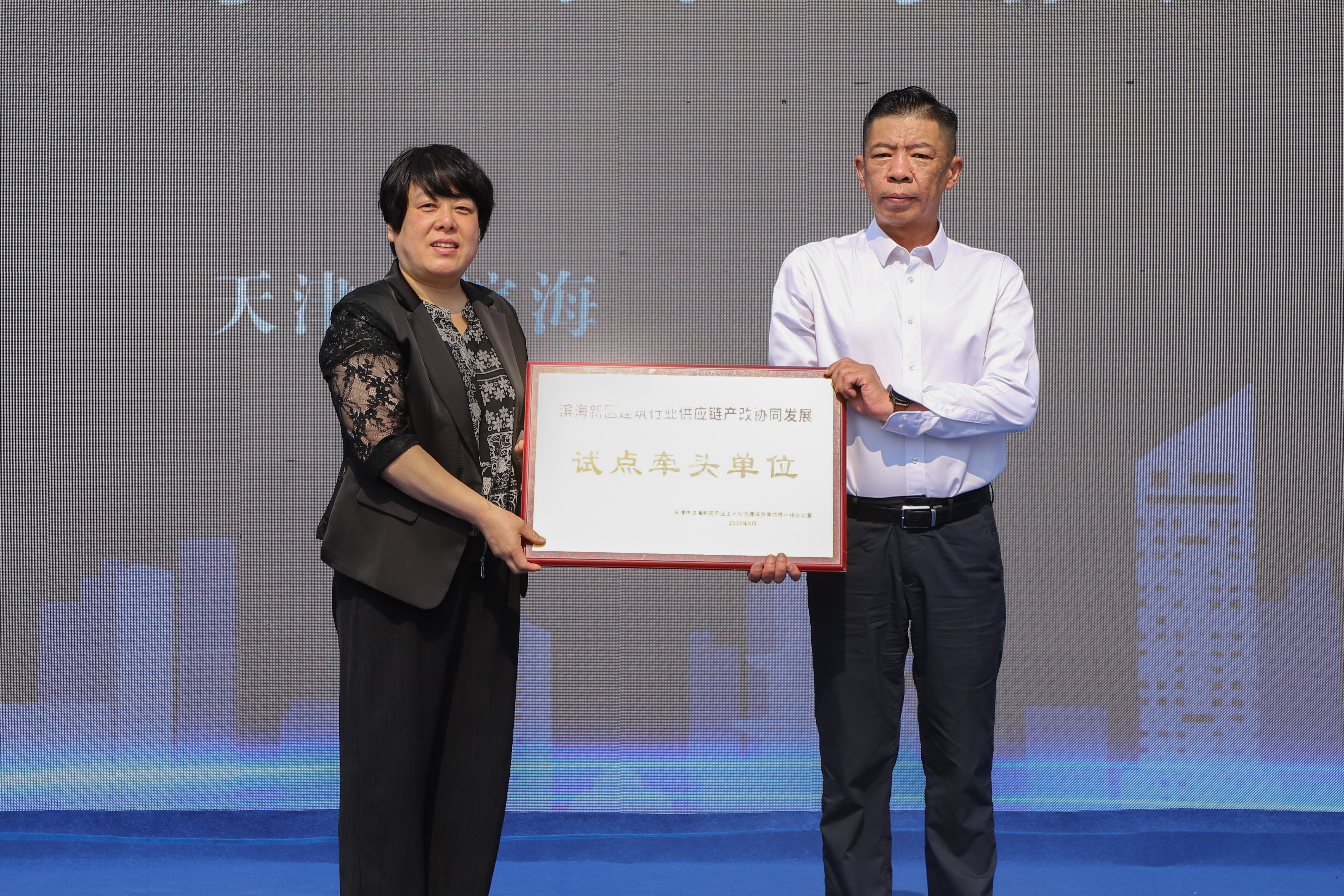 宮麗艷為中建二局四公司濱海新區(qū)建筑行業(yè)供應(yīng)鏈產(chǎn)改試點(diǎn)牽頭單位授牌